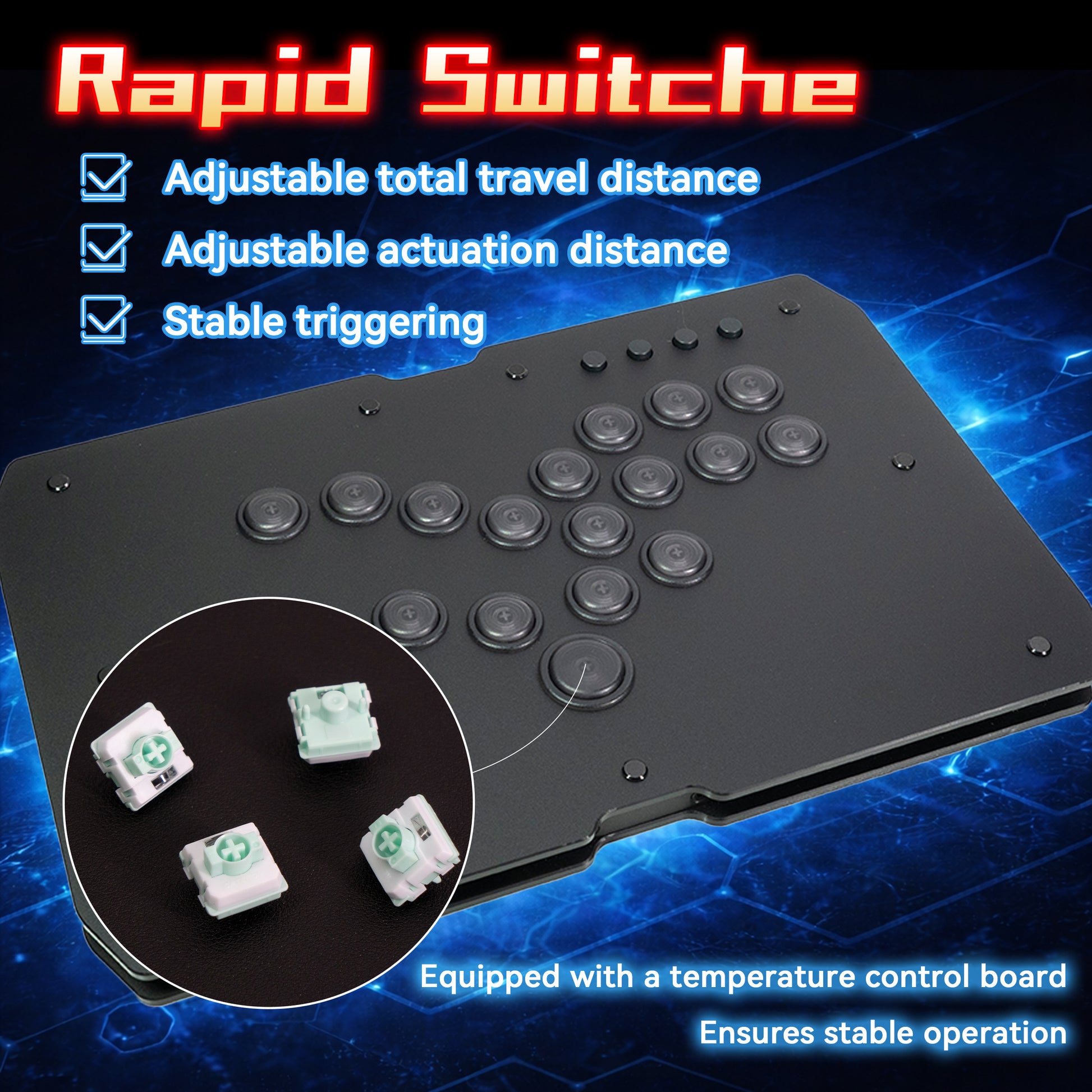 霞軸はTIKITAKA FTGが格闘ゲーム専用に独自開発したカスタムスイッチです。作動点0.5mm・全行程1.5mmの超高感度設計で、わずかな指の動きで即座に反応します。